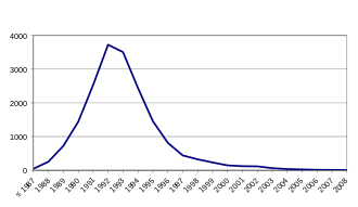 Four cases were reported globally in 2017, and the condition is considered to be nearly eradicated.[1] In the United Kingdom, from 1986 to 2015, more than 184,000 cattle were diagnosed with the peak of new cases occurring in 1993.[3] A few thousand additional cases have been reported in other regions of the world.[1] It is believed that a few million cattle with the condition likely entered the food supply during the outbreak.[1]