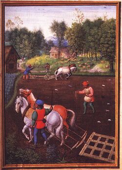 Open-field planting refers to the form of sowing used historically in the agricultural context whereby fields are prepared generically and left open, as the name suggests, before being sown directly with seed. The seed is frequently left uncovered at the surface of the soil before germinating and therefore exposed to the prevailing climate and conditions like storms etc. This is in contrast to the seedbed method used more commonly in domestic gardening or more specific (modern) agricultural scenarios where the seed is applied beneath the soil surface and monitored and manually tended frequently to ensure more successful growth rates and better yields.