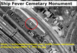 During the mid-19th century, workers constructing the Victoria Bridge across the St. Lawrence River discovered a mass grave in Windmill Point where victims of the typhus epidemic of 1847 had been quarantined in fever sheds. The workers, many of whom were of Irish descent, were unsettled by the discovery and wanted to create a memorial to ensure the grave, which held the coffins of 6,000 Irish immigrants, would not be forgotten.[6][10] Erected on December 1, 1859, the stone was the first Canadian monument to represent the famine. The inscription on the stone reads: