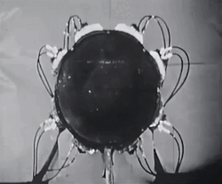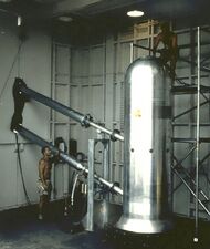 The picture below shows the Shrimp device, detonated on March 1, 1954, at Bikini, as the Castle Bravo test. Its 15-megaton explosion was the largest ever by the United States. The silhouette of a man is shown for scale. The device is supported from below, at the ends. The pipes going into the shot cab ceiling, which appear to be supports, are actually diagnostic light pipes. The eight pipes at the right end (1) sent information about the detonation of the primary. Two in the middle (2) marked the time when X-rays from the primary reached the radiation channel around the secondary. The last two pipes (3) noted the time radiation reached the far end of the radiation channel, the difference between (2) and (3) being the radiation transit time for the channel.[73]