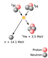 Fusion produces neutrons which dissipate energy from the reaction.[14] In weapons, the most important fusion reaction is called the D-T reaction. Using the heat and pressure of fission, hydrogen-2, or deuterium (2D), fuses with hydrogen-3, or tritium (3T), to form helium-4 (4He) plus one neutron (n) and energy:[15]