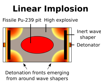In the two-point linear implosion, the nuclear fuel is cast into a solid shape and placed within the center of a cylinder of high explosive. Detonators are placed at either end of the explosive cylinder, and a plate-like insert, or shaper, is placed in the explosive just inside the detonators. When the detonators are fired, the initial detonation is trapped between the shaper and the end of the cylinder, causing it to travel out to the edges of the shaper where it is diffracted around the edges into the main mass of explosive. This causes the detonation to form into a ring that proceeds inward from the shaper.[23]