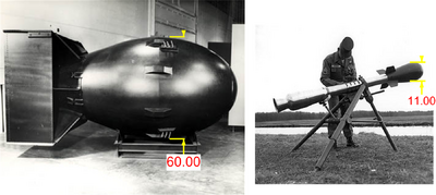 One of the applications of the W54 was the Davy Crockett XM-388 recoilless rifle projectile. It had a dimension of just 11 inches (28 cm), and is shown here in comparison to its Fat Man predecessor (60 inches (150 cm)).