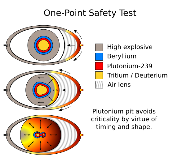 Alternatively, the pit can be "safed" by having its normally hollow core filled with an inert material such as a fine metal chain, possibly made of cadmium to absorb neutrons. While the chain is in the center of the pit, the pit cannot be compressed into an appropriate shape to fission; when the weapon is to be armed, the chain is removed. Similarly, although a serious fire could detonate the explosives, destroying the pit and spreading plutonium to contaminate the surroundings as has happened in several weapons accidents, it could not cause a nuclear explosion.Lua error: Internal error: The interpreter has terminated with signal "24".