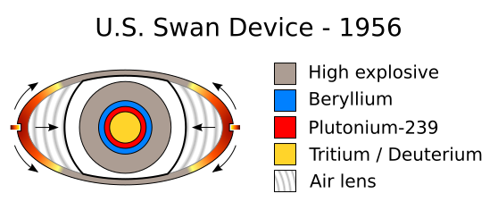The first device whose dimensions suggest employment of all these features (two-point, hollow-pit, fusion-boosted implosion) was the Swan device. It had a cylindrical shape with a diameter of 11.6 in (29 cm) and a length of 22.8 in (58 cm).[citation needed]