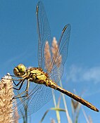 The giant dragonfly-like insect Meganeura monyi grew to wingspans of 75 cm (2 ft 6 in) in the late Carboniferous, around 300 million years ago.[39]
