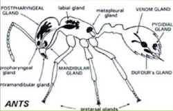 Some species use vibrations for communicating, such as to attract mates as in the songs of the shield bug Nezara viridula.[101] Vibrations can also be used to communicate between species; lycaenid caterpillars, which form a mutualistic association with ants communicate with ants in this way.[102] The Madagascar hissing cockroach has the ability to press air through its spiracles to make a hissing noise as a sign of aggression;[103] the death's-head hawkmoth makes a squeaking noise by forcing air out of their pharynx when agitated, which may also reduce aggressive worker honey bee behavior when the two are close.[104]