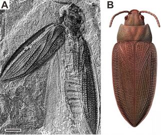 Beetle Moravocoleus permianus, fossil and reconstruction, from the Early Permian