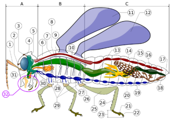 The head is enclosed in a hard, heavily sclerotized, unsegmented head capsule, which contains most of the sensing organs, including the antennae, compound eyes, ocelli, and mouthparts.[40] The thorax is composed of three sections named (from front to back) the prothorax, mesothorax and metathorax. The prothorax carries the first pair of legs. The mesothorax carries the second pair of legs and the front wings. The metathorax carries the third pair of legs and the hind wings.[8][40] The abdomen is the largest part of the insect, typically with 11–12 segments, and is less strongly sclerotized than the head or thorax. Each segment of the abdomen has sclerotized upper and lower plates (the tergum and sternum), connected to adjacent sclerotized parts by membranes. Each segment carries a pair of spiracles.[40]