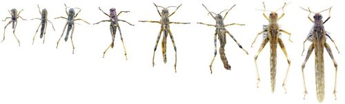 Hemimetabolous insects, those with incomplete metamorphosis, change gradually after hatching from the egg by undergoing a series of molts through stages called instars, until the final, adult, stage is reached. An insect molts when it outgrows its exoskeleton, which does not stretch and would otherwise restrict the insect's growth. The molting process begins as the insect's epidermis secretes a new epicuticle inside the old one. After this new epicuticle is secreted, the epidermis releases a mixture of enzymes that digests the endocuticle and thus detaches the old cuticle. When this stage is complete, the insect makes its body swell by taking in a large quantity of water or air, which makes the old cuticle split along predefined weaknesses where the old exocuticle was thinnest.[84][85]