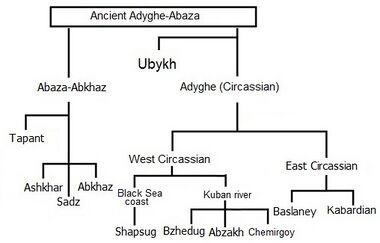 There are five recognized languages in the Northwest Caucasian family: Abkhaz, Abaza, Kabardian or East Circassian, Adyghe or West Circassian, and Ubykh.[4][9] They are classified as follows: