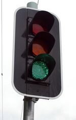 Green can communicate safety to proceed, as in traffic lights.[58] Green and red were standardized as the colors of international railroad signals in the 19th century.[59] The first traffic light, using green and red gas lamps, was erected in 1868 in front of the Houses of Parliament in London. It exploded the following year, injuring the policeman who operated it. In 1912, the first modern electric traffic lights were put up in Salt Lake City, Utah. Red was chosen largely because of its high visibility, and its association with danger, while green was chosen largely because it could not be mistaken for red. Today green lights universally signal that a system is turned on and working as it should. In many video games, green signifies both health and completed objectives, opposite red.