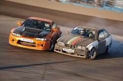 R/C drifting refers to the act of drifting with a radio-controlled car. R/C cars are equipped with special low-grip tires, usually made from PVC or ABS piping. Some manufacturers make radial drift tires that are made of actual rubber compounds. The car's setup is usually changed to allow it to drift more easily. R/C drifting is most successful on AWD R/C cars. However, RWD chassis drift cars offer the most realistic experience. In fact beginners will be more at ease with AWD chassis. The drift is easier to handle compared to the RWD chassis. With more experience, they turn to drive with RWD. However the RWD being more expensive, it is advised to start with AWD chassis. Many very good AWD cars with a robust chassis[31] can be found for less than 50 US dollars, what makes this hobby affordable for all. The RWD chassis for more advanced driver could be found above 1,000 US dollars. Companies such as Overdose, Yokomo, MST, Tamiya, Team Associated, and Hobby Products International[32] have made dedicated drift cars and supported the hobby.[33]