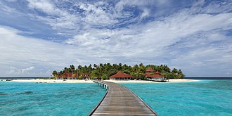A coral island is a type of island formed from coral detritus and associated organic material.[1] It occurs in tropical and sub-tropical areas, typically as part of a coral reef which has grown to cover a far larger area under the sea. The term low island can be used to distinguish such islands from high islands, which are formed through volcanic action.[2][3] Low islands are formed as a result of sedimentation upon a coral reef or of the uplifting of such islands.