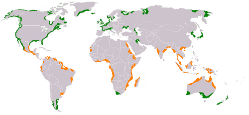 Vegetated coastal ecosystems occur throughout the world, as illustrated in the diagram on the right. Seagrass beds are found from cold polar waters to the tropics. Mangrove forests are confined to tropical and sub-tropical areas, while tidal marshes are found in all regions, but most commonly in temperate areas. Combined, these ecosystems cover about 50 million hectares and provide a diverse array of ecosystem services such as fishery production, coastline protection, pollution buffering, as well as high rates of carbon sequestration.[25][24]