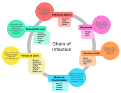 There is a general chain of events that applies to infections, sometimes called the chain of infection[15] or transmission chain. The chain of events involves several steps – which include the infectious agent, reservoir, entering a susceptible host, exit and transmission to new hosts. Each of the links must be present in a chronological order for an infection to develop. Understanding these steps helps health care workers target the infection and prevent it from occurring in the first place.[16]