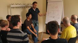 Mark Shuttleworth (standing) and other Canonical employees discuss Launchpad at a design sprint in Germany in 2006