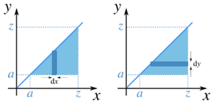 In this expression, the second integral is calculated first with respect to y and x is held constant—a strip of width dx is integrated first over the y-direction (a strip of width dx in the x direction is integrated with respect to the y variable across the y direction), adding up an infinite amount of rectangles of width dy along the y-axis. This forms a three dimensional slice dx wide along the x-axis, from y=a to y=x along the y-axis, and in the z direction z=h(y). Notice that if the thickness dx is infinitesimal, x varies only infinitesimally on the slice. We can assume that x is constant.[3] This integration is as shown in the left panel of Figure 1, but is inconvenient especially when the function h(y) is not easily integrated. The integral can be reduced to a single integration by reversing the order of integration as shown in the right panel of the figure. To accomplish this interchange of variables, the strip of width dy is first integrated from the line x = y to the limit x = z, and then the result is integrated from y = a to y = z, resulting in: