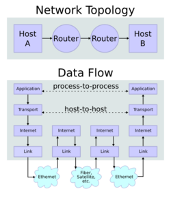 Below this top layer, the transport layer connects applications on different hosts with a logical channel through the network. It provides this service with a variety of possible characteristics, such as ordered, reliable delivery (TCP), and an unreliable datagram service (UDP).
