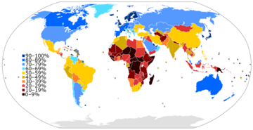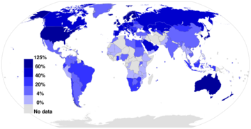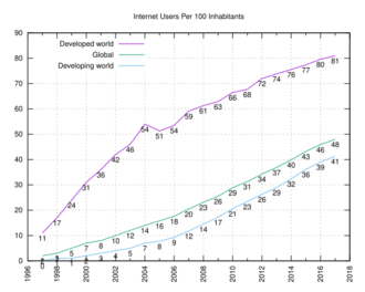 Between 2000 and 2009, the number of Internet users globally rose from 390 million to 1.9 billion.[97] By 2010, 22% of the world's population had access to computers with 1 billion Google searches every day, 300 million Internet users reading blogs, and 2 billion videos viewed daily on YouTube.[98] In 2014 the world's Internet users surpassed 3 billion or 44 percent of world population, but two-thirds came from the richest countries, with 78 percent of Europeans using the Internet, followed by 57 percent of the Americas.[99] However, by 2018, Asia alone accounted for 51% of all Internet users, with 2.2 billion out of the 4.3 billion Internet users in the world. China's Internet users surpassed a major milestone in 2018, when the country's Internet regulatory authority, China Internet Network Information Centre, announced that China had 802 million users.[100] China was followed by India, with some 700 million users, with the United States third with 275 million users. However, in terms of penetration, in 2022 China had a 70% penetration rate compared to India's 28% and the United States's 90%.[101] In 2022, 54% of the world's Internet users were based in Asia, 14% in Europe, 7% in North America, 10% in Latin America and the Caribbean, 11% in Africa, 4% in the Middle East and 1% in Oceania.[102] In 2019, Kuwait, Qatar, the Falkland Islands, Bermuda and Iceland had the highest Internet penetration by the number of users, with 93% or more of the population with access.[103] As of 2022, it was estimated that 5.4 billion people use the Internet, more than two-thirds of the world's population.[104]
