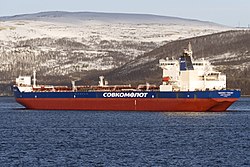 In 2007, the Russian state-owned shipping company Sovcomflot ordered three 70,000 DWT double acting arctic shuttle tankers from Samsung Heavy Industries, South Korea , to transport oil from the Varandey oil terminal and two similarly-sized ships of slightly different design from Admiralty Shipyard in St. Petersburg, Russia, for the Prirazlomnoye field. The first ship, Vasily Dinkov, was delivered in 2007 and its two sister ships, Kapitan Gotsky and Timofey Guzhenko in 2008 and 2009, respectively.[21] Kirill Lavrov, the first double acting tanker built in a Russian shipyard, was delivered in 2009 and the last of the series, Mikhail Ulyanov, in 2010.[22][23] The tankers, equipped with two Azipod units, are capable of bow loading and independent operation in level ice up to 1.2 meters in thickness.[22]