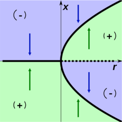 For [math]\displaystyle{ r\lt 0 }[/math], there is one stable equilibrium at [math]\displaystyle{ x = 0 }[/math]. For [math]\displaystyle{ r\gt 0 }[/math] there is an unstable equilibrium at [math]\displaystyle{ x = 0 }[/math], and two stable equilibria at [math]\displaystyle{ x = \pm\sqrt{r} }[/math].
