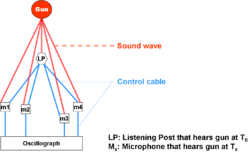 In the "Sound Ranging" graphic, the manned Listening (or Advanced) Post, is sited a few 'sound seconds (or about 2000 yards) forward of the line of the unattended microphones, it sends an electrical signal to the recording station to switch on the recording apparatus. The positions of the microphones are precisely known. The differences in sound time of arrival, taken from the recordings, were then used to plot the source of the sound by one of several techniques. See http://nigelef.tripod.com/p_artyint-cb.htm#SoundRanging