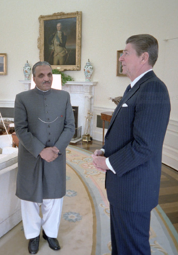 This was despite warm relations between Zia and the President of the largest Western country (US President Ronald Reagan), and strong support for Zia from that country.[125] Also ironic was that under Zia's rule (according to leftist cultural critic Nadeem F. Paracha), economic prosperity expanded the country's urban middle and lower-middle-classes, and spread the popularity of Western 1980s fashion wear, hairstyle and pop music.[126][127]