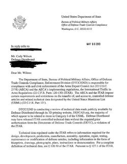 Letter from the United States Department of State to Defense Distributed (May 8, 2013).