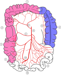 In addition, ischemic colitis is a well-recognized complication of abdominal aortic aneurysm repair, when the origin of the inferior mesenteric artery is covered by the aortic graft.[13][14] In a 1991 review concerning 2137 patients the accidental inferior mesenteric artery ligation was the most common cause (74%) of ischemic colitis.[15] Thus, patients without adequate collateralization are at risk for ischemia of the descending and sigmoid colon. Bloody diarrhea and leukocytosis in the postoperative period are essentially diagnostic of ischemic colitis. The complication can be prevented through careful selection of subjects that may require replanting inferior mesenteric artery (IMA) and completing the pre surgical procedure information with an instrumental evaluation during surgical treatment.[16]