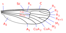 Dixidae are small (body length not more than 5.0 mm) slender gnats with thin legs. Adults are black to yellowish-brown.[4] The head is relatively broad. The antennae are thin and the flagellum has 14 segments. The proboscis is short and thick and the palpi are five-segmented. The thorax is slightly convex. The wing veins are without scales (with scales in the closely related family Culicidae. The subcosta is fused with the costa at the level of the base of Rs or slightly proximal to this. The wing venation exhibits radial, medial, and cubital forks (R 4 branched, M 2 branched, Cu 2 branched). R 2+ 3 is strongly arched, the r–m crossvein is distinct, and the discal cell is absent. The anal vein of the wing is long. The genitalia of the male is inverted at 180° by torsion of segments 5–8.