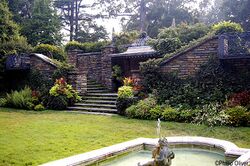 In 1921, the Blisses hired landscape gardener Beatrix Farrand to design the garden at Dumbarton Oaks, and for almost thirty years Mildred Bliss collaborated closely with Farrand. Together they transformed the existing farmlands surrounding the house into terraced garden rooms and vistas, creating a garden landscape that progressed from formal and elegant stepped terraces, in the near vicinity of the house, to a more recreational and practical middle zone of pools, tennis court, orchards, vegetable beds, and cutting gardens, and concluding at the far reaches of the property with a rustic wilderness of meadows and stream.[22] Within the garden rooms, Bliss and Farrand used a careful selection of plant materials and garden ornaments to define the rooms’ character and use. Since that time, other architects working with Mildred Bliss—most notably Ruth Havey and Alden Hopkins—changed certain elements of the Farrand design. The garden at Dumbarton Oaks was first opened to the public in 1939. The Dumbarton Oaks Park is a 27-acre naturalistic streamside valley park, maintained as a part of Rock Creek Park.[23]