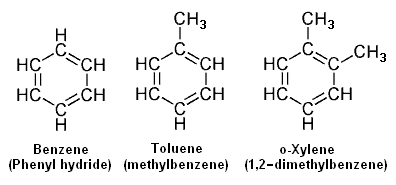The adjacent image depicts three of the most common aromatics, namely benzene (C6H6), toluene (C7H8 and o-xylene (C8H10). There are three possible xylenes referred to as ortho-xylene (o-xylene), meta-xylene (m-xylene) and para-xylene (p-xylene).