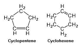 Cyclic unsaturated hydrocarbons have a closed ring of carbon atoms in a polygon configuration having the same number of vertices as the number of carbon atoms. If the hydrocarbons have a ring containing a single double bond between two of the carbons, the hydrocarbons are referred to as cycloalkenes or cycloolefins. The adjacent image depicts two such cycloalkenes with single double bonds, namely cyclopentene (C5H8) and cyclohexene (C6H10).