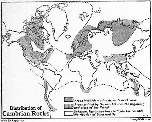 Any attempt to picture the geographical conditions of the Cambrian period must of necessity be very imperfect. It was pointed out by Barrande that early in Palaeozoic Europe there appeared two marine provinces—a northern one extending from Russia to the British Isles through Scandinavia and northern Germany, and a southern one comprising France, Bohemia, the Iberian peninsula and Sardinia. It is assumed that some kind of land barrier separated these two provinces. Further, there is a marked likeness between the Cambrian of western Europe and eastern America; many fossils of this period are common to Britain, Sweden and eastern Canada; therefore it is likely that a north Atlantic basin existed. Prof. Kayser suggests that there was also a Pacific basin more extensive than at present; this is borne out by the similarity between the Cambrian faunas of China, Siberia and Argentina. The same author postulates an Arctic continent, bordering upon northern Europe, Greenland and North America; an African-Brazilian continent across the present south Atlantic, and a marine communication between Australia and India, where the faunas have much in common.