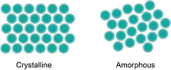 In condensed matter physics and materials science, an amorphous solid (or non-crystalline solid) is a solid that lacks the long-range order that is characteristic of a crystal. The terms "glass" and "glassy solid" are sometimes used synonymously with amorphous solid; however, these terms refer specifically to amorphous materials that undergo a glass transition.[1] Examples of amorphous solids include glasses, metallic glasses, and certain types of plastics and polymers.[2][3]