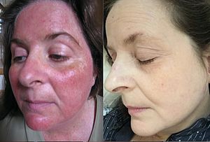 | Topical Steroid induced rosacea (left); after steroid withdrawal and photobiomodulation therapy (right). | |