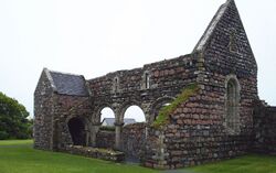 Scotland was relatively poorly supplied with nunneries, with 30 identified for the period to 1300, compared with 150 for England, and very few in the Highlands.[22][23] Prioresses like Anna MacLean (d. 1543) of Iona Nunnery, were figures with considerable authority: appointing lay officers, managing lands and finances as well as the lives of the nuns under them.[24] There may have been small numbers of anchorites, who isolated themselves from society and devoted themselves to God, but they have left very few traces in the records.[25] The Virgin Mary, as the epitome of a wife and mother, was probably an important model for women.[26] There is evidence from late Medieval burghs like Perth, of women, usually wives, acting through relatives and husbands as benefactors or property owners connected with local altars and cults of devotion. In Perth there were several altars devoted to aspects of Marian worship in the Parish church of St. John, a chapel dedicated to St. Anne, the mother of Mary, or Lady's Chapel and the Loreto Chapel, dedicated to the Virgin's Holy House. Around the town several monasteries were also dedicated to the Virgin.[27] Queen Margaret became important after her canonisation in 1250 and after the ceremonial transfer of her remains to Dunfermline Abbey, as one of the most revered national saints.[28] New cults of devotion connected with Jesus and the Virgin Mary began to reach Scotland in the fifteenth century, including the Five Wounds, the Holy Blood and the Holy Name of Jesus. There were also new religious feasts, including celebrations of the Presentation, the Visitation and Mary of the Snows.[29][30]
