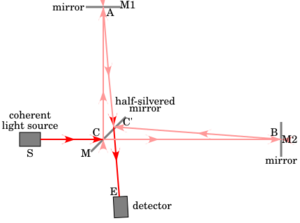 A Michelson interferometer consists minimally of mirrors M1 & M2 and a beam splitter M. In Fig 2, a source S emits light that hits the beam splitter (in this case, a plate beamsplitter) surface M at point C. M is partially reflective, so part of the light is transmitted through to point B while some is reflected in the direction of A. Both beams recombine at point C' to produce an interference pattern incident on the detector at point E (or on the retina of a person's eye). If there is a slight angle between the two returning beams, for instance, then an imaging detector will record a sinusoidal fringe pattern as shown in Fig. 3b. If there is perfect spatial alignment between the returning beams, then there will not be any such pattern but rather a constant intensity over the beam dependent on the differential pathlength; this is difficult, requiring very precise control of the beam paths.