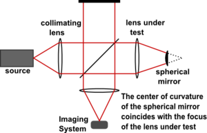 The use of a figured reference mirror in one arm allows the Twyman–Green interferometer to be used for testing various forms of optical component, such as lenses or telescope mirrors.[10] Fig. 6 illustrates a Twyman–Green interferometer set up to test a lens. A point source of monochromatic light is expanded by a diverging lens (not shown), then is collimated into a parallel beam. A convex spherical mirror is positioned so that its center of curvature coincides with the focus of the lens being tested. The emergent beam is recorded by an imaging system for analysis.[11]