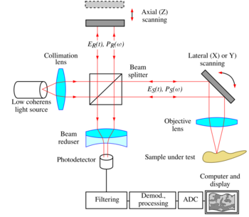 Another application of the Michelson interferometer is in optical coherence tomography (OCT), a medical imaging technique using low-coherence interferometry to provide tomographic visualization of internal tissue microstructures. As seen in Fig. 8, the core of a typical OCT system is a Michelson interferometer. One interferometer arm is focused onto the tissue sample and scans the sample in an X-Y longitudinal raster pattern. The other interferometer arm is bounced off a reference mirror. Reflected light from the tissue sample is combined with reflected light from the reference. Because of the low coherence of the light source, interferometric signal is observed only over a limited depth of sample. X-Y scanning therefore records one thin optical slice of the sample at a time. By performing multiple scans, moving the reference mirror between each scan, an entire three-dimensional image of the tissue can be reconstructed.[17][18] Recent advances have striven to combine the nanometer phase retrieval of coherent interferometry with the ranging capability of low-coherence interferometry.[19]