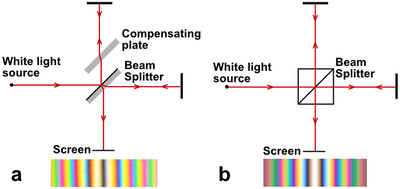 White light has a tiny coherence length and is difficult to use in a Michelson (or Mach–Zehnder) interferometer. Even a narrowband (or "quasi-monochromatic") spectral source requires careful attention to issues of chromatic dispersion when used to illuminate an interferometer. The two optical paths must be practically equal for all wavelengths present in the source. This requirement can be met if both light paths cross an equal thickness of glass of the same dispersion. In Fig. 4a, the horizontal beam crosses the beam splitter three times, while the vertical beam crosses the beam splitter once. To equalize the dispersion, a so-called compensating plate identical to the substrate of the beam splitter may be inserted into the path of the vertical beam.[3]:16 In Fig. 4b, we see using a cube beam splitter already equalizes the pathlengths in glass. The requirement for dispersion equalization is eliminated by using extremely narrowband light from a laser.