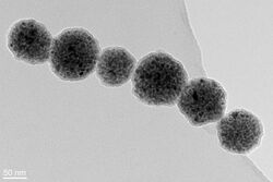 Magnetic nanochains are a new class of magnetoresponsive and superparamagnetic nanostructures with highly anisotropic shapes which can be manipulated using magnetic field and magnetic field gradient.[2][3] Such nanochains consist of self-assembled nanoparticle clusters which are magnetically assembled and fixated into a chain. Among the various linking methods used are silica coating, polyacrylic acid (PAA) coating, tetraethoxysilane condensation, biotinylation or glucose decomposition. Typically, the primary building blocks of these nanostructures are individual superparamagnetic iron oxide nanoparticles (SPIONs). Nanoparticle clusters which are composed of a number of individual magnetic nanoparticles (ca. 100 SPIONs) are known as magnetic nanobeads with a diameter of 50–200 nanometers.[4]