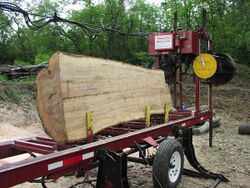 More recently, with the invention of the Wood-Mizer in 1982,[3] portable bandsaw mills represented a dramatic shift in design. Unlike traditional mills, they used a thin-kerf blade of the type used on a band saw rather than a circular blade, which reduced weight and cost, and reduced the size and weight of the bearings and support blocks. The smaller kerf on these blades dramatically increased the yield from a given log. Use of band blades also allowed for a different design where the head, consisting of the blade and a power source, moves back and forth while the log remains stationary.[4] This is in contrast to traditional mills where the log moves on a trolley while the blade remains fixed. Many companies now manufacture and sell personal and portable sawmills.[5]