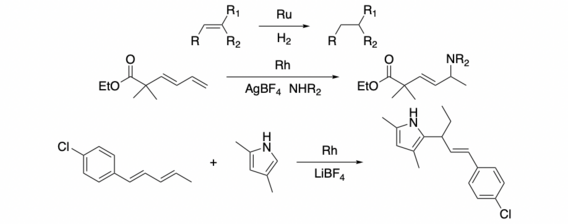- ↑ 8.0 8.1 8.2 Goldfogel, Matthew; Roberts, Courtney; Meek, Simon (2014). "Intermolecular Hydroamination of 1,3-Dienes Catalyzed by Bis(phosphine)carbodicarbene-Rhodium Complexes". Journal of the American Chemical Society 136 (17): 6227–6230. doi:10.1021/ja502275w. PMID 24742315. https://pubs.acs.org/doi/10.1021/ja502275w.