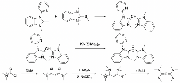 Similar non-cyclic carbodicarbenes have also been successfully synthesised from iminium salts through the condensation of two equivalents of the starting material in dimethylacetamide (DMA), followed by nucleophilic substitution with dimethylamine, then deprotonation with n-butyllithium to form a tetraaminoallene which acts as a carbodicarbene.[22] Additionally, a method of facile synthesis of asymmetric carbodicarbenes was developed by Chen et al. in 2015 by using a simple nucleophilic substitution reaction.[23] Reacting an olefin substituted with a N-heterocyclic carbene scaffold with a thioether containing a different NHC moiety generates a product which can be readily deprotonated to afford a carbodicarbene with two different carbene substituents with improved functionality.[23]
