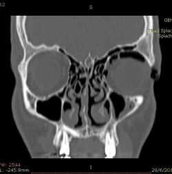 True orbital emphysema occurs when there is air behind an intact orbital septum.[6][3][36] This condition arises due to a fracture of more than one bony orbital walls of paranasal sinuses and tearing of adjacent sinus mucosa, and communication of a sinus with the orbit is established. This fracture usually involves the ethmoid, and sometimes involves frontal, sphenoid, and maxillary sinuses.[6][3][36] The air usually enters the orbit when the pressure within the upper respiratory tract is increased due to expiratory efforts, nose blowing or sneezing.[6]