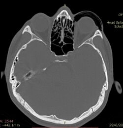 Computed tomography is effective and sensitive in the diagnosis of orbital emphysema,[3][37] as it can confirm the anatomical location and size of air, bony defects, indentation of the eyeball, and the condition of the optic nerve, as well as the presence of any extraocular muscle entrapment and herniation of preorbital fat into the sinus cavities.[3][15][38] The location of the orbital emphysema is present near the site of the fracture.[1][3] The scans are usually taken along the transverse plane. Transverse images allow the evaluation of fractures in medial and lateral orbital walls. By reformatting these transverse images or taking coronal images, the examination of orbital floor and roof is permitted. Helical scanning is preferred as it has a lower imaging time and radiation dose comparing to conventional scanning, especially when reforming transverse helical scans into coronal images.[3] The staging of orbital emphysema can then be determined with visual acuity examination and ophthalmoscopy.[6] A disadvantage of using a CT scan is that when detecting air after orbital trauma, the presence of a wooden foreign object can give a false positive result of orbital emphysema. The wooden object can mimic the presence of orbital emphysema. Therefore, patients’ medical history is crucial in making the correct diagnosis.[3]