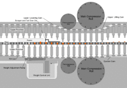 Tablet presses, also called tableting machines, range from small, inexpensive bench-top models that make one tablet at a time (single-station presses), with only around a half-ton pressure, to large, computerized, industrial models (multi-station rotary presses) that can make hundreds of thousands to millions of tablets an hour with much greater pressure. The tablet press is an essential piece of machinery for any pharmaceutical and nutraceutical manufacturer. Tablet presses must allow the operator to adjust the position of the lower and upper punches accurately, so that the tablet weight, thickness and density/hardness can each be controlled. This is achieved using a series of cams, rollers, or tracks that act on the tablet tooling (punches). Mechanical systems are also incorporated for die filling, and for ejecting and removing the tablets from the press after compression. Pharmaceutical tablet presses are required to be easy to clean and quick to reconfigure with different tooling, because they are usually used to manufacture many different products. There are two main standards of tablet tooling used in pharmaceutical industry: American standard TSM and European standard EU. TSM and EU configurations are similar to each other but cannot be interchanged.[12]