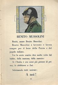 Benito Mussolini was portrayed as the embodiment of Italian Fascism and was keen to be seen as such.[45] Mussolini was styled by other Italian fascists as Il Duce ("The Leader"). Since Mussolini was represented as an almost omniscient leader, a common saying in Italy during Mussolini's rule was "The Duce is always right" (Italian: Il Duce ha sempre ragione).[46] Mussolini became a unifying force in Italy in order for ordinary Italians to put their difference to one side with local officials. The personality cult surrounding Mussolini became a way for him to justify his personal rule and it acted as a way to enable social and political integration.